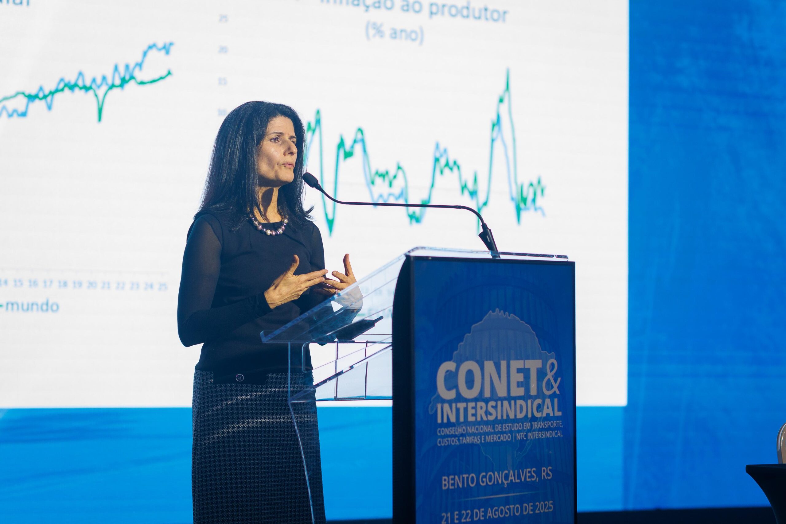 Após a pausa para o coffee break, a economista Zeina Latif apresentou a palestra “Cenário Econômico e Perspectivas para o Transporte Rodoviário de Cargas”, trazendo uma análise sobre os fatores externos e internos que influenciam diretamente o setor. Ela destacou o impacto do “tarifaço” do presidente Donald Trump, que afetou 35,9% das exportações brasileiras destinadas aos Estados Unidos até o momento, o equivalente a 0,7% do PIB, e levantou reflexões sobre a necessidade de o Brasil avançar em acordos comerciais e se consolidar como um parceiro confiável no cenário global.
