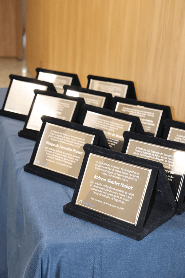 Após a palestra, o Setcemg e a Fetcemg entregaram homenagens a representantes das Polícias Rodoviária Federal, Rodoviária Estadual, Militar, Civil e Guardas Civis de Betim e Contagem pelo trabalho realizado no combate ao roubo de cargas.