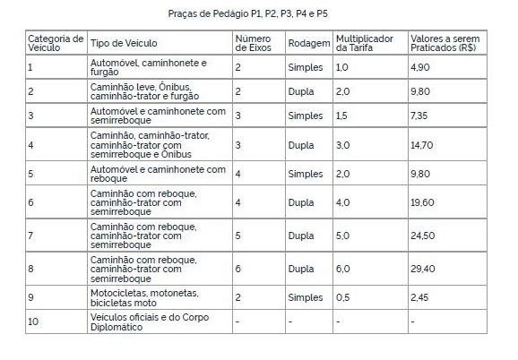 Reajuste abrange as seguintes praças de pedágio: